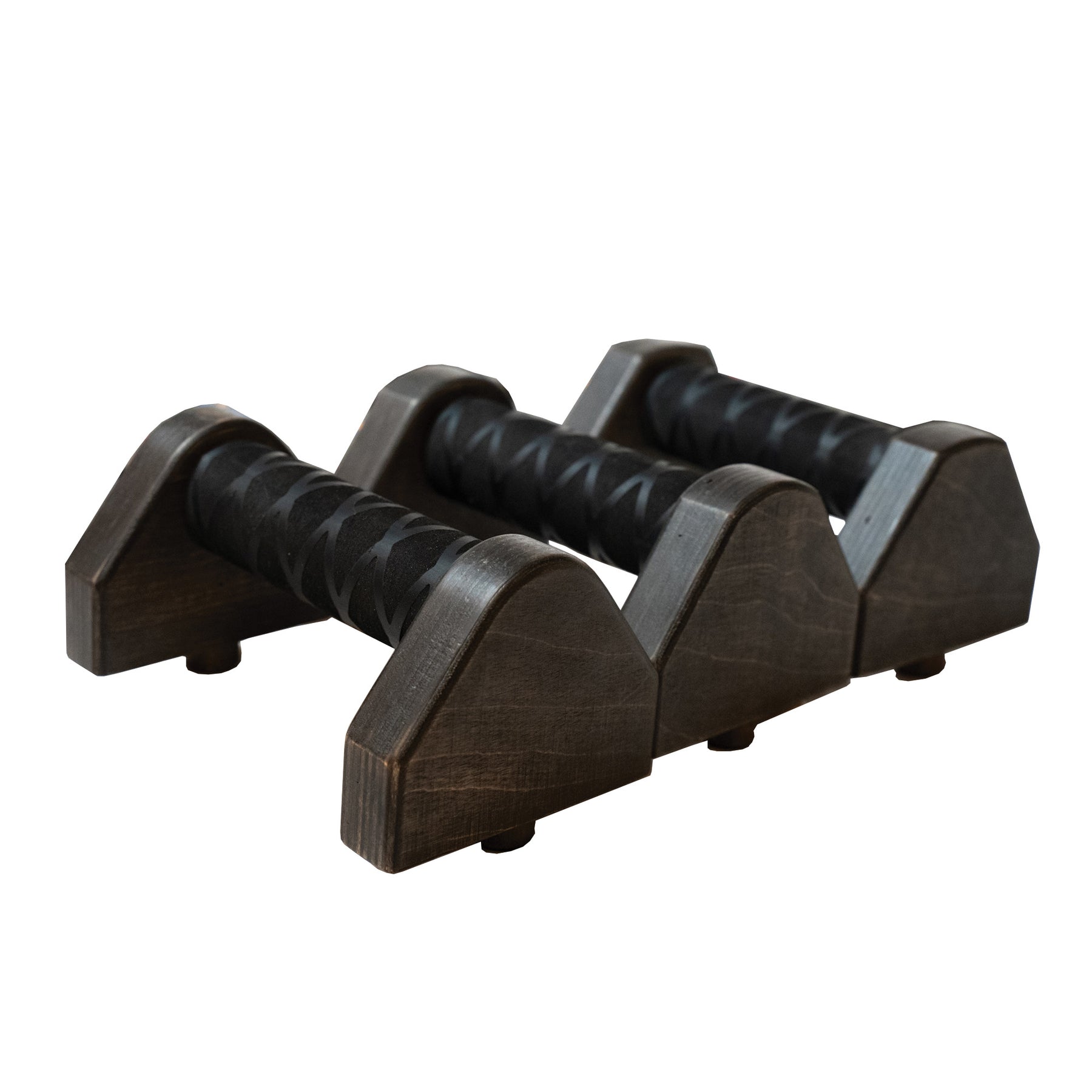 Each of the three handles is equipped with cozy rubber bars. These handles can serve either as regular handles on the pushup side of the Pushboard or as a static balance point under the board for extra complicated pushups.