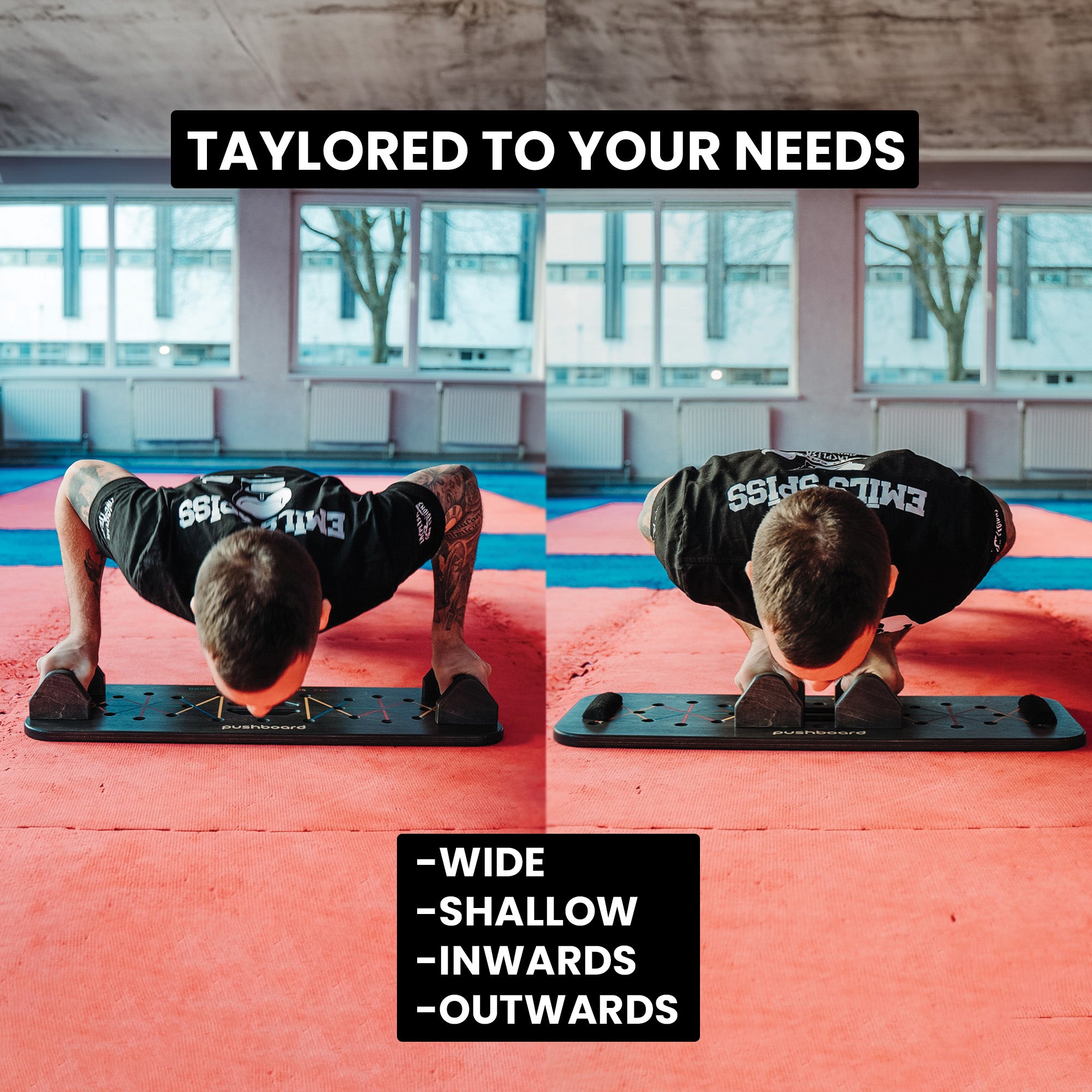 Adjustable difficulty levels ensure a tailored workout, allowing you to target different muscle groups and progressively challenge your fitness. This also means that one Pusboard can be shared between two or more people doing sets one after an other without spending long time adjusting the equipment.