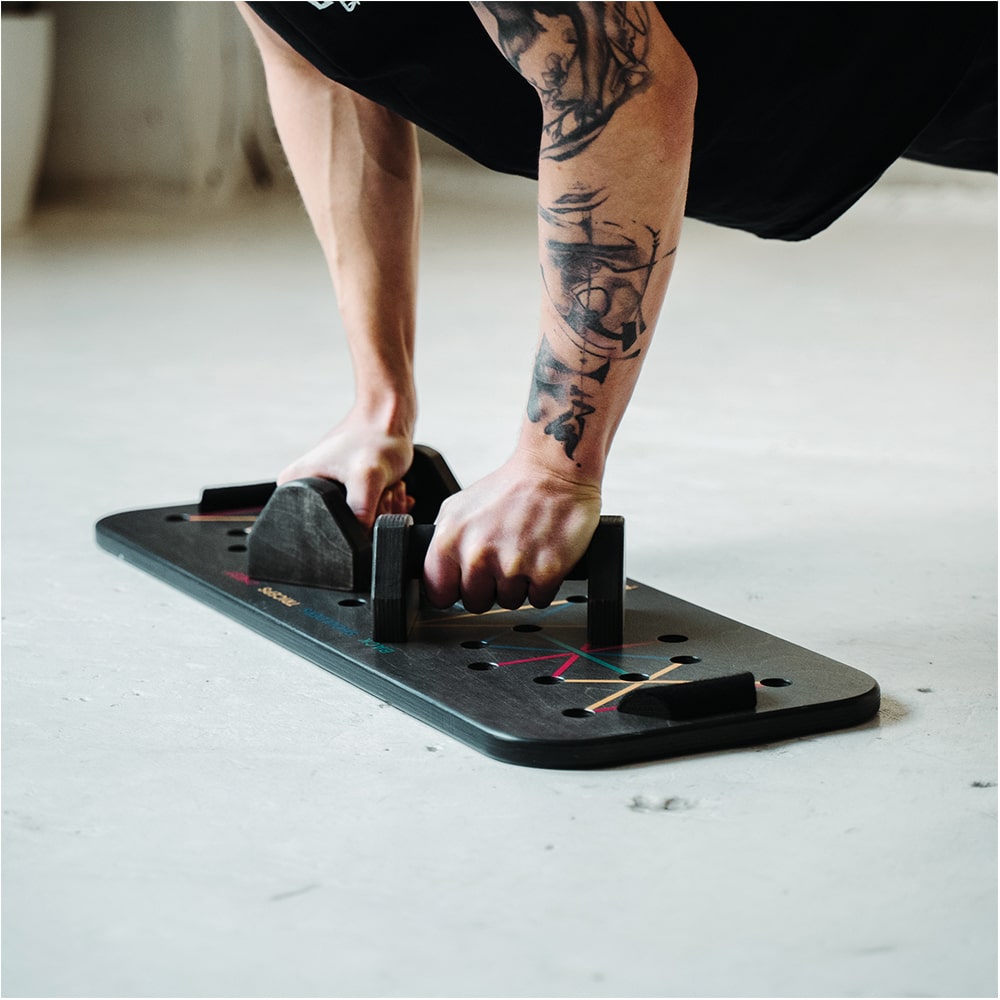 With the addition of handles and strategically placed holes, this side is optimized to cover the essential muscle groups during balance-pushup training.