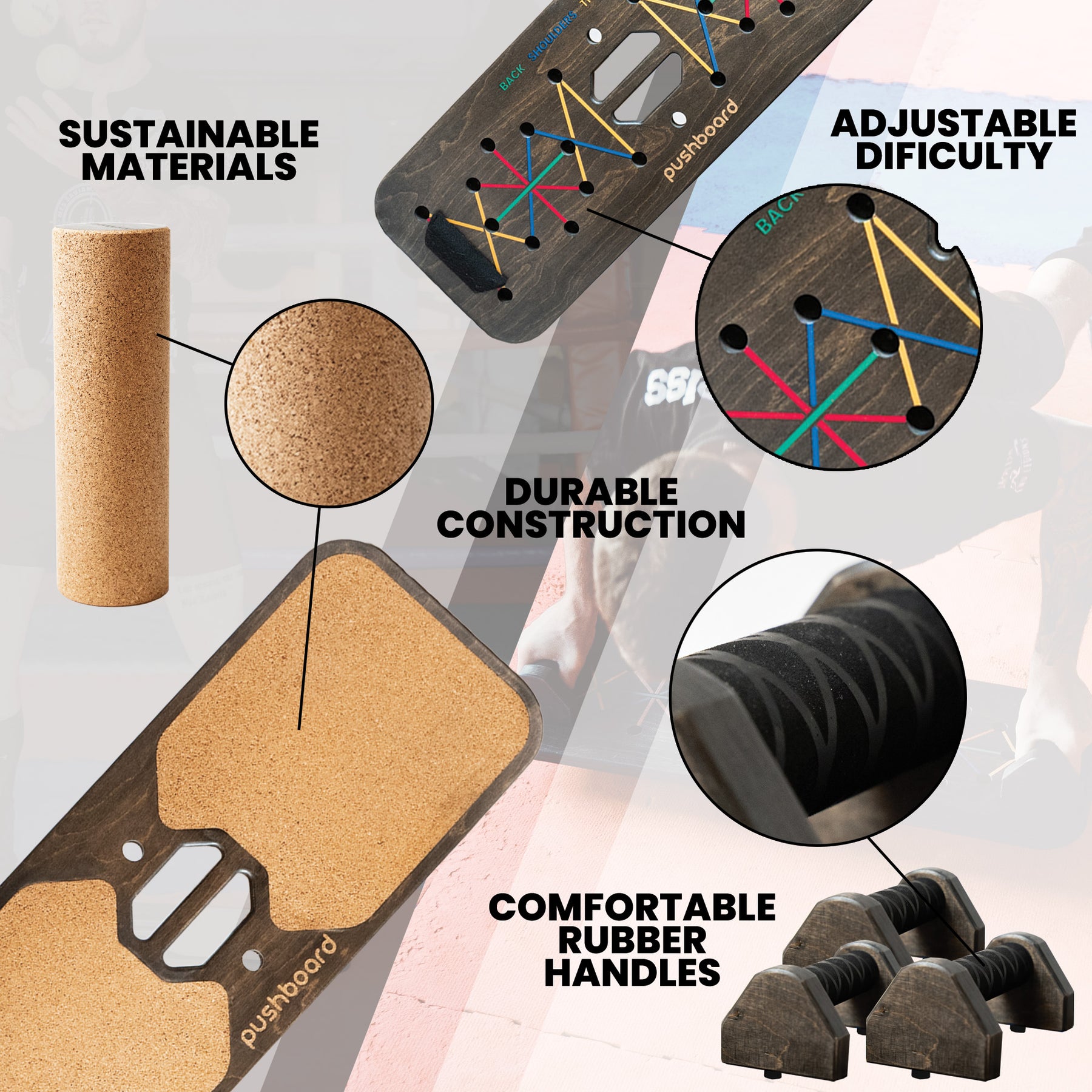 The sturdy cork-covered roll is an essential component for setting up your Pushboard for balancing exercises. Additionally, it serves as a versatile tool that can be used as a massage roll after completing your exercises.